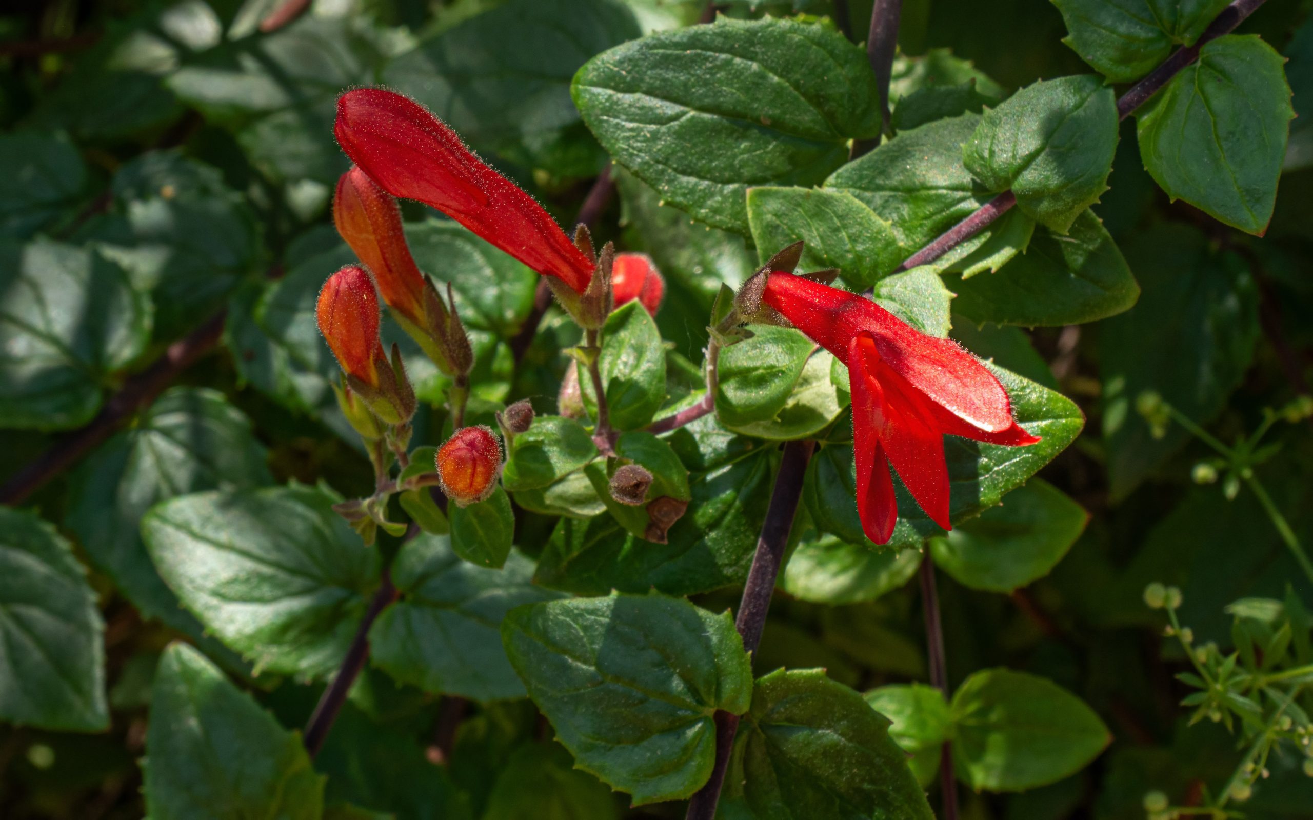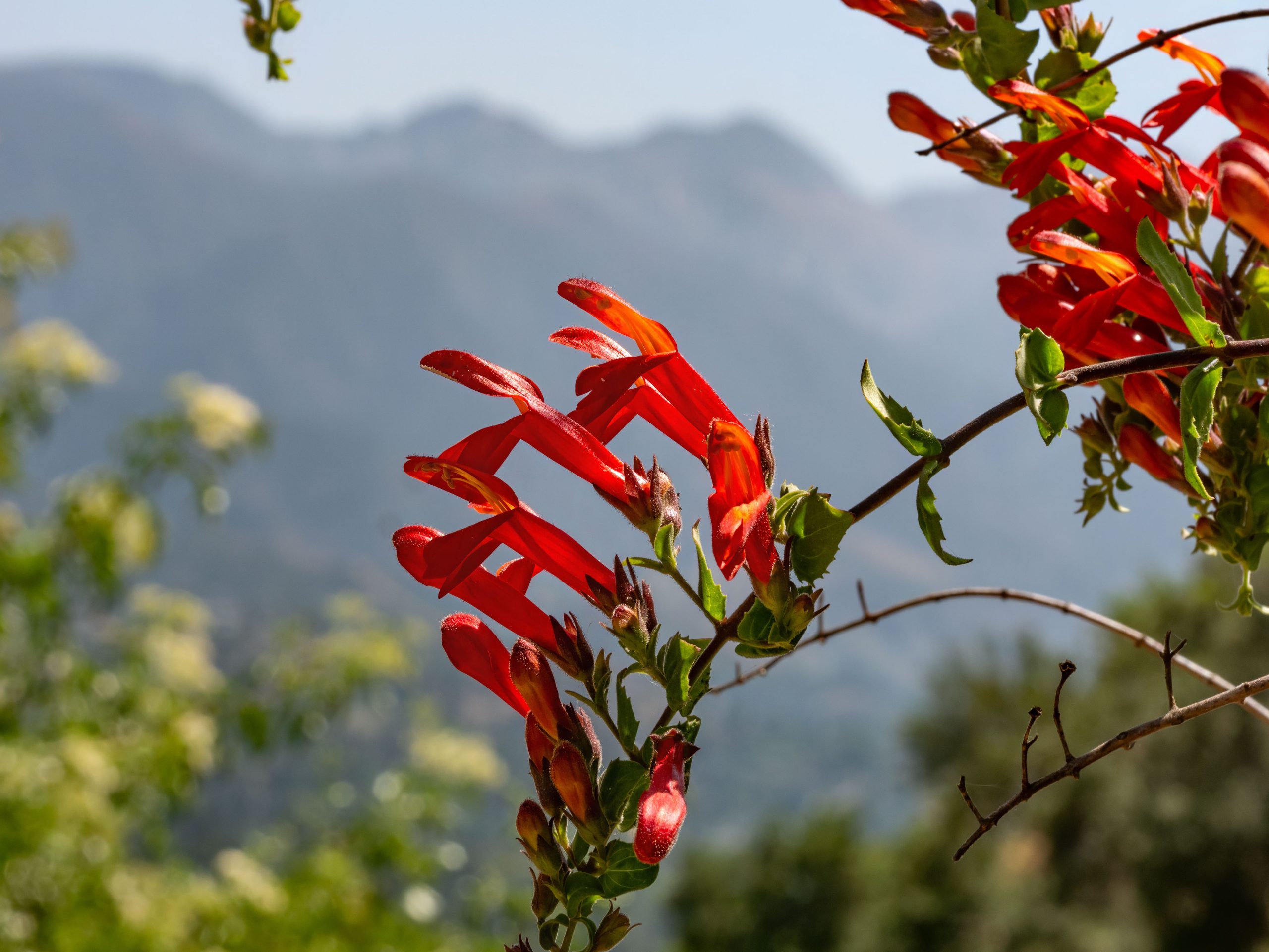 Heartleaf Penstemon (Keckiella cordifolia) isn’t subtle. It’s about as RED as red can be, and it’s often happy to — literally! — get in your face. See, it’s a vine, and like all vines, it loves to climb and or wander. Sometimes it can bunch up and look like a regular shrub, but just as often it sneaks up through some other plant, or even climbs twenty feet up a tree, only to dangle delectably over a trail or fire road. Needless to say, it’s beloved by hummingbirds and butterflies. Oh, and also by hikers!